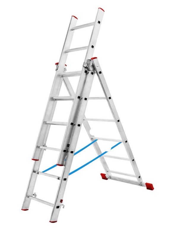 Алюминиевая трехсекционная лестница АЛ 3х16 П80 предназначена для бытового и профессионального использования. Может использоваться как выдвижная, приставная и раздвижная лестница или стремянка. Устойчива к прогибу и раскачиванию. Компактна при хранении и транспортировке. Прочные направляющие и фиксаторы обеспечивают удобную трансформацию лестницы. Широкая поперечная траверса с наконечниками увеличивает опорную площадь на 55%. Самофиксирующиеся крюки-защёлки надёжно закрепляют секции и препятствуют их произвольному выскальзыванию при работе и транспортировке. Устойчивые к атмосферным воздействиям нейлоновые ремни препятствуют нежелательному раздвижению лестниц в рабочем положении. Ярко-красные заглушки закрывают торцы направляющих и маркируют габариты лестницы. Гарантированная нагрузка на ступень - 150 кг.