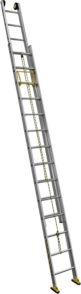 Алюминиевая выдвижная лестница Centaure C2 NEW с тросом 2х18 414418 - комфортабельная лестница для работы на больших высотах. Специально сделанные ступеньки с наклоном обеспечивают удобное положение ступени при использовании. Уникальная надежная система стального замка-коромысла с двойным рычагом. Автоматическая блокировка под действием силы тяжести. Испытана на нагрузку в 400 кг. Шарнирные башмаки, подошва снабжены индикатором износа. Простое использование благодаря кольцевому сердечнику. Встроенная система ползунков по всей длине профиля гарантирует оптимальную установку в рабочее положение и прочность лестницы при максимальном выдвижении секций. Направляющие из алюминия, рассчитанные на интенсивное ежедневное использование. Алюминиевые нескользящие ступени 28 х 25.5 мм. Расстояние между ступенями 280 мм. Надёжное крепление ступеней к направляющим путём тройного зажима и фальцевания. Ролик из алюминиевого сплава, диаметром 125 мм; не оставляют следов на опорных поверхностях.
