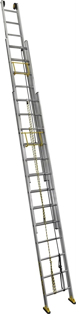 Алюминиевая выдвижная лестница Centaure C3 NEW с тросом 3х20 414620 - комфортабельная лестница для работы на больших высотах. Специально сделанные ступеньки с наклоном обеспечивают удобное положение ступени при использовании. Уникальная надежная система стального замка-коромысла с двойным рычагом. Автоматическая блокировка под действием силы тяжести. Испытана на нагрузку в 400 кг. Шарнирные башмаки, подошва снабжены индикатором износа. Простое использование благодаря кольцевому сердечнику. Встроенная система ползунков по всей длине профиля гарантирует оптимальную установку в рабочее положение и прочность лестницы при максимальном выдвижении секций. Направляющие из алюминия, рассчитанные на интенсивное ежедневное использование. Алюминиевые нескользящие ступени 28 х 25.5 мм. Расстояние между ступенями 280 мм. Надёжное крепление ступеней к направляющим путём тройного зажима и фальцевания. Ролик из алюминиевого сплава, диаметром 125 мм; не оставляют следов на опорных поверхностях.
