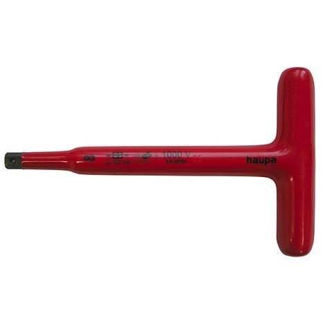 Диэлектрическая отвертка Haupa VDE РК 4 с поперечной ручкой 110058   предназначена для болтов с внутренним шестигранником. Полностью изолирована согласно VDE 0682/201. Изготовлена из ванадий-молибденового сплава. Двухцветная изоляция погружением (внутри желтая, снаружи красная).