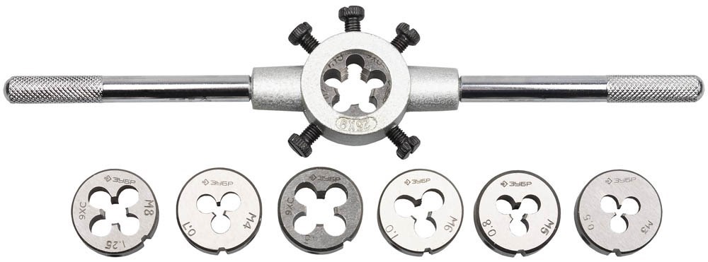 - плашек (7шт) 3х0,5 4х0,7 5х0,8 6х1,0 8х1,25 10х1,5 12х1,75;