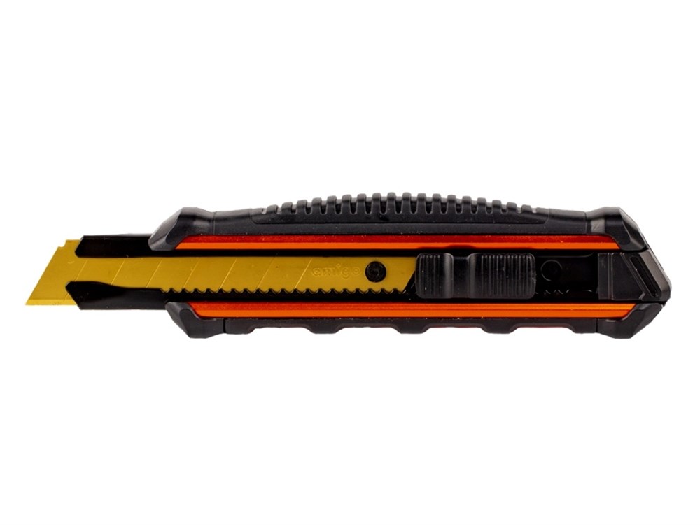 Нож cтроительный Amigo 18 мм 77552 — профессиональный инструмент с эргономичным дизайном для комфортной и безопасной работы. Оснащён алюминиевым корпусом с вставками из прочного пластика, лезвием из японской стали SK5 с покрытием TiN, прочной стальной направляющей и фиксатором лезвия.