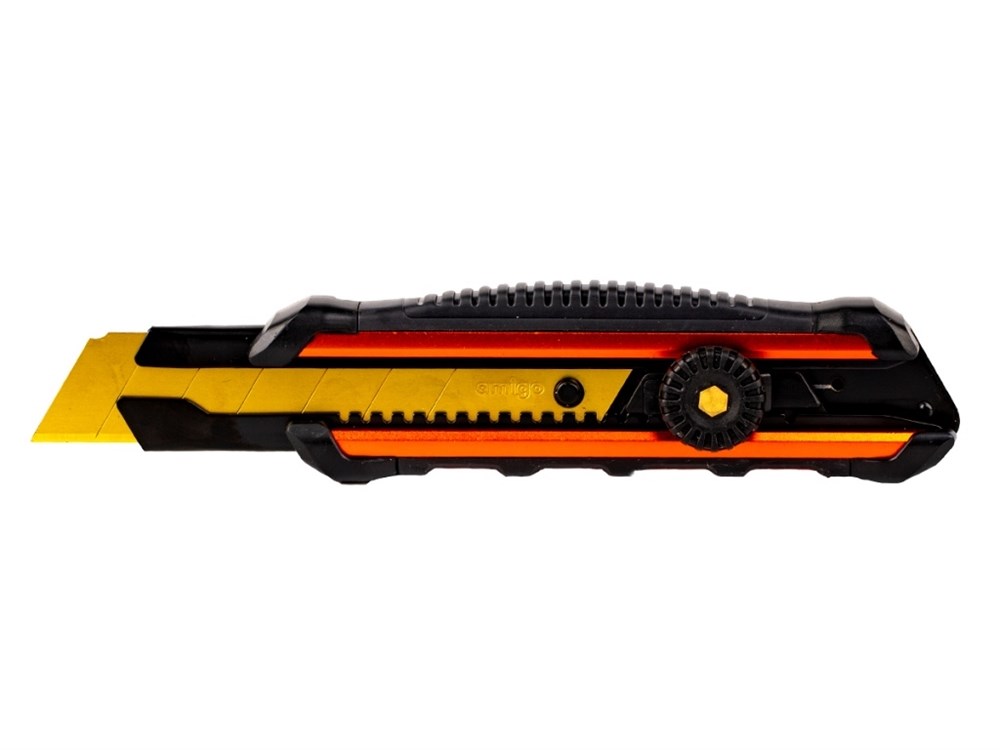 Нож строительный Amigo 25 мм 77553 — профессиональный инструмент с эргономичным дизайном для точных и безопасных работ. Оснащён алюминиевым корпусом с вставками из прочного пластика, лезвием из японской стали SK5 с покрытием нитридом титана TiN, прочной стальной направляющей и фиксатором лезвия.