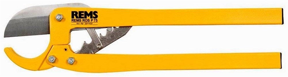 Ножницы для резки труб REMS ROS P 75 - это удобный высококачественный инструмент для ровной резки труб. Также можно использовать для резки тонкостенных труб. Прочный алюминиевый корпус. Сменные, специальные закаленные клиновидные лезвия. Отрез ровно под прямым углом и без грата, благодаря точному упору трубы. Резка без стружки - никакой стружки в трубе не остаётся. Быстрый возврат лезвия. В комплект входит лезвие для данной модели ножниц.