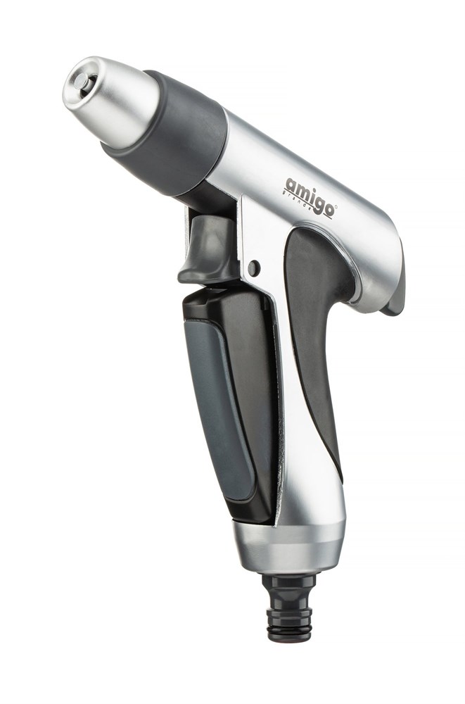Пистолет-распылитель Amigo 79091 металлический — надёжный и удобный инструмент для полива садовых растений. Металлический корпус обеспечивает долговечность и защиту от коррозии. Регулировка распыления и напора воды позволяет выбрать оптимальный режим полива. Эргономичная рукоятка с противоскользящими элементами и soft кольцо обеспечивают комфорт и надёжный хват. Фиксатор клавиши позволяет длительно распылять воду без усилий. Пластиковые детали из термостойкого ABS-пластика устойчивы к УФ-излучению. Герметичное крепление к шлангу гарантирует быстрое и надёжное подключение.