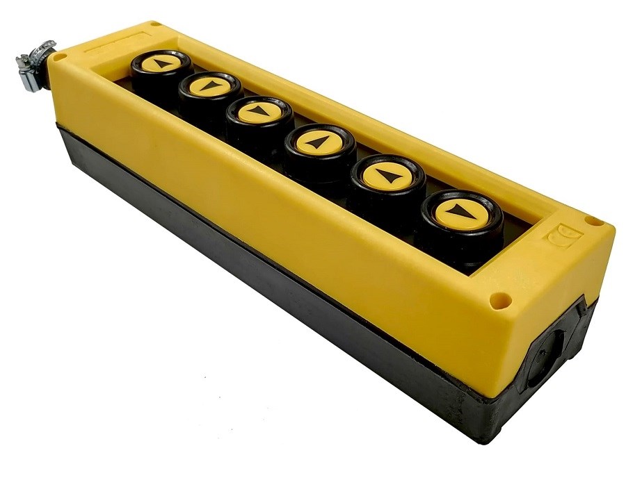 Пульт управления EMAS PVK6E предназначен для управления кранами, кран-балками, тельферами, цепными и канатными талями, мостовыми и козловыми кранами.  Может иметь несколько вариантов исполнения: двух, трех, четырех, пяти, шести, семи, восьми, девяти, десяти, одиннадцати и двенадцатикнопочные, включать аварийный останов, аварийный сигнал, сигнал, ключ марку, кнопку (переключатель) вкл / выкл питания, световой фильтр, клавиши увеличения или уменьшения скорости работы двигателя, двух или четырех позиционные джойстики. Изготовлен из высококачественного пластика армированного стекловолокном,