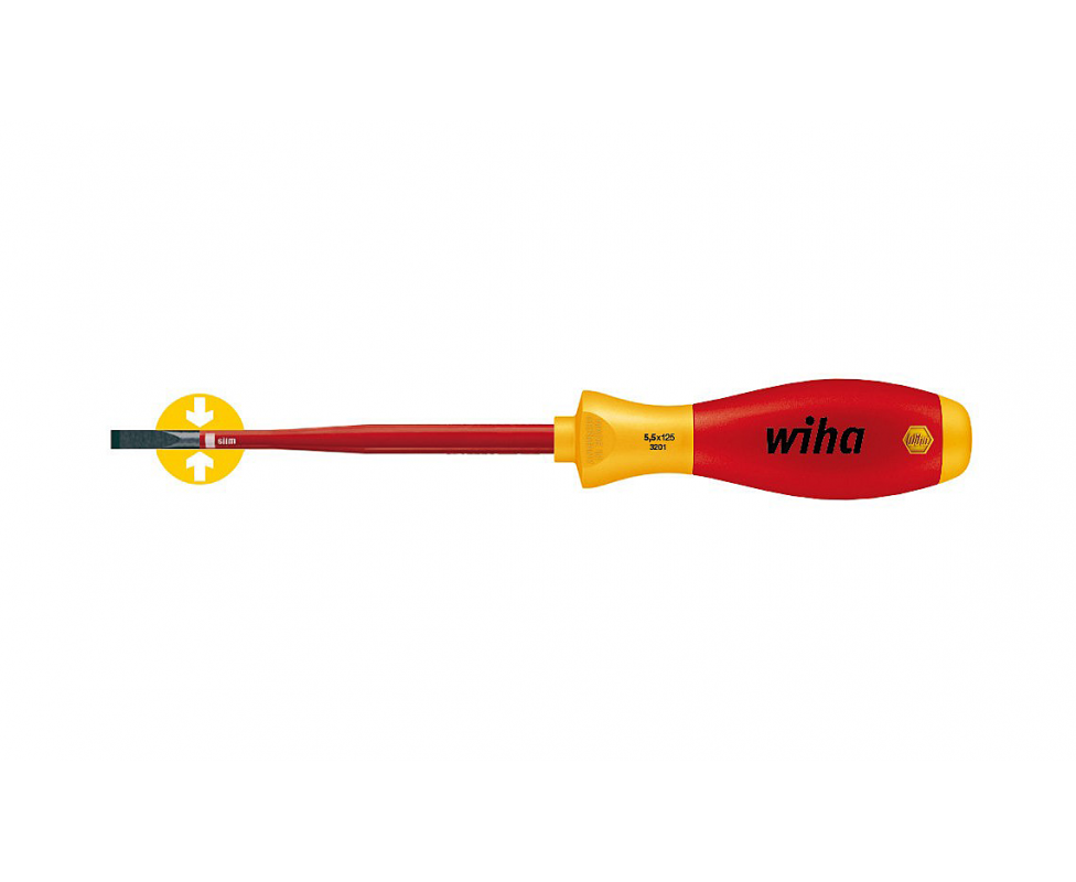Шлицевая отвертка Wiha SoftFinish electric slimFix 3201 SL 4,5x125 35501 - диэлектрическая отвертка с тонким жалом из высококачественной хром-ванадий-молибденовой стали. Защитное изоляционное напыление гарантирует безопасность (VDE и GS) при работе с деталями под напряжением до 1000 В. Интегрированная защитная изоляция.